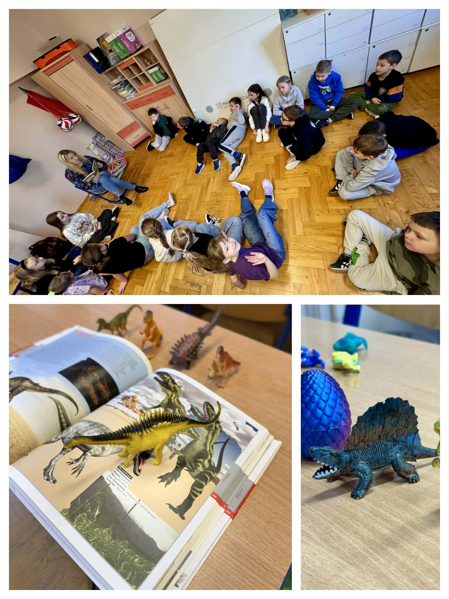 Po powrocie do sali lekcyjnej uczniowie obejrzeli film edukacyjny dotyczący dawnych mieszkańców naszej planety oraz poszukiwali informacji w książkach edukacyjnych, które przynieśli do szkoły. Wykonali też tropy pradawnych stworzeń w masie solnej. Jeśli chcecie wiedzieć czy dinozaury mogłyby żyć w dzisiejszych czasach lub czy my moglibyśmy żyć wtedy, gdy to one rządziły światem śmiało pytajcie.